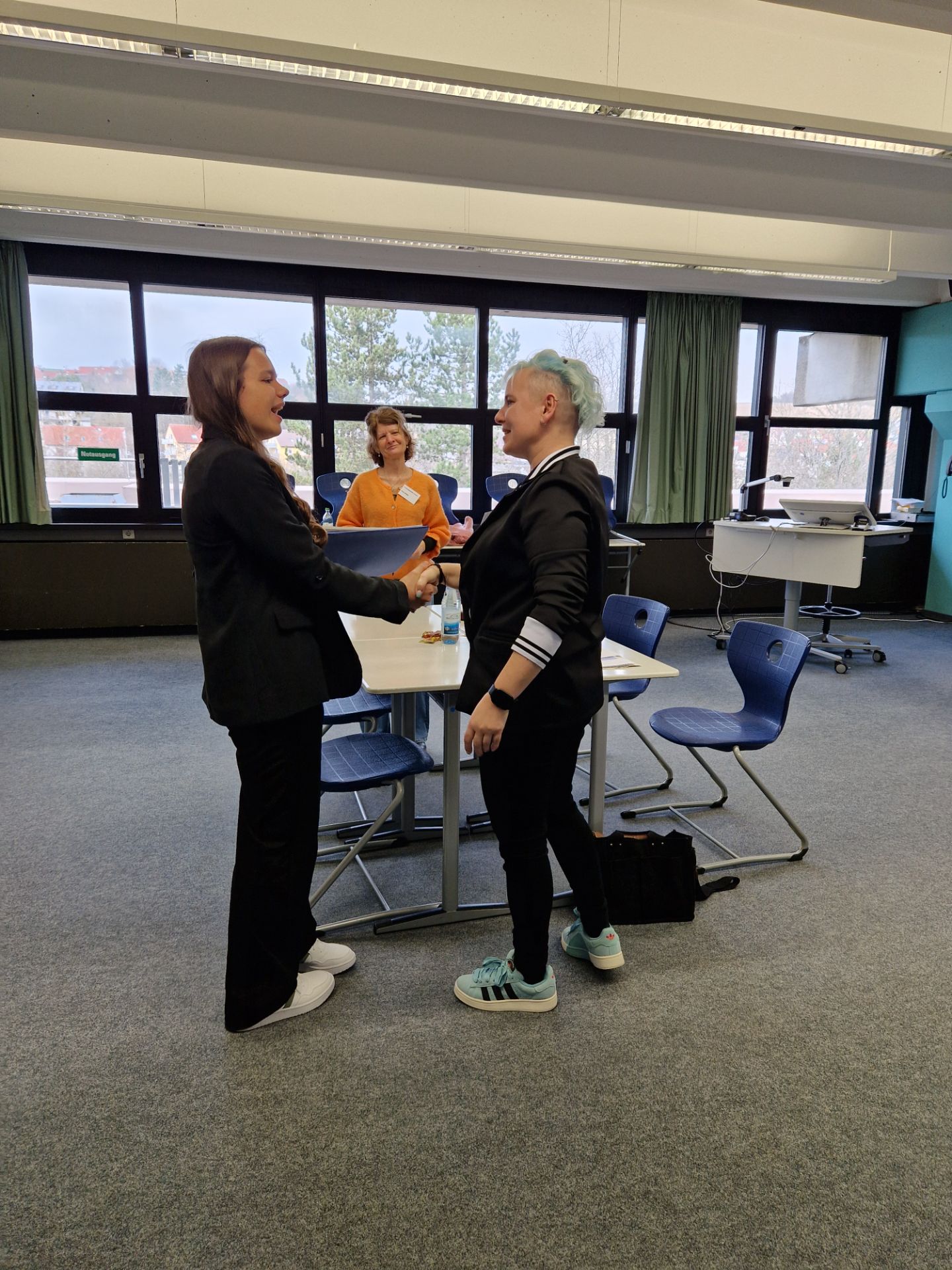 Frau Brückler von der Firma MIWE begrüßt einen Neuntklässler, bevor es in den Gesprächsraum geht.