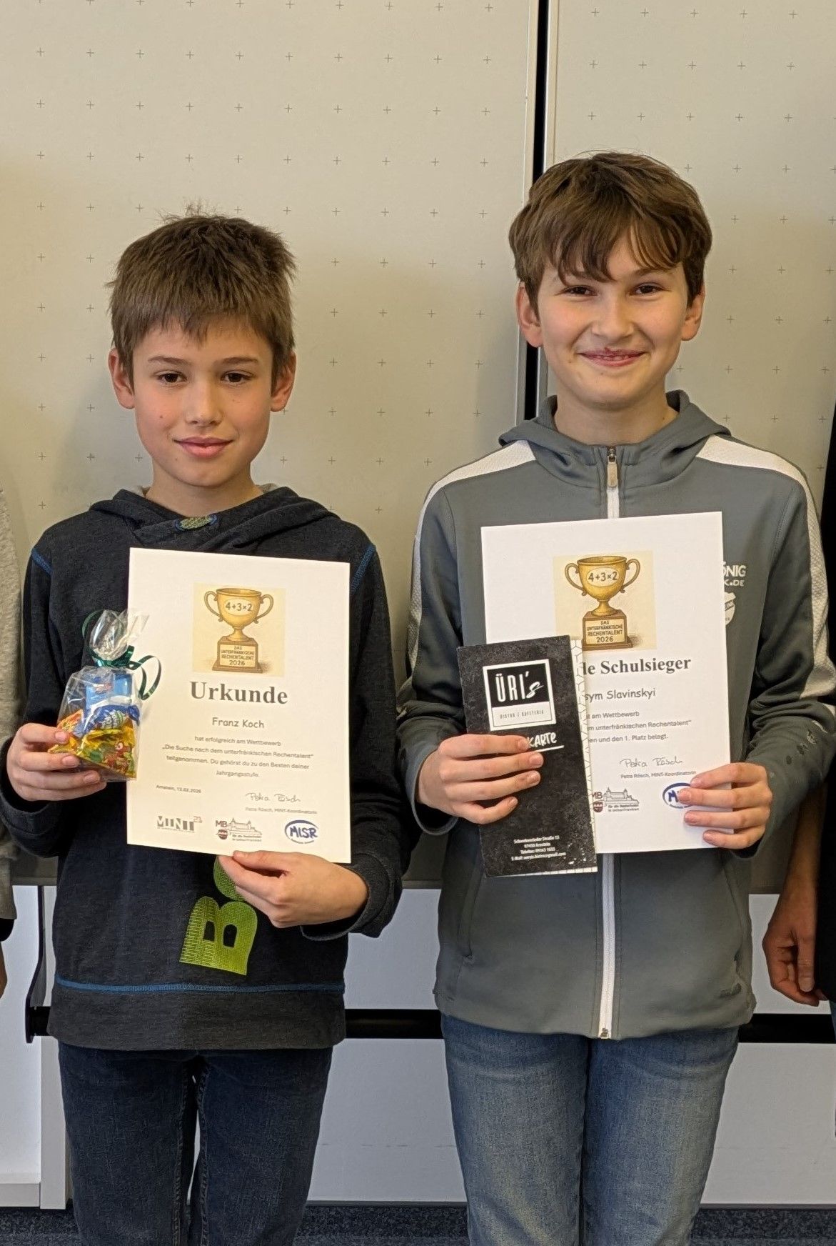 Zunächst wurde innerhalb der drei 5. Klassen ein schriftlicher Rechenwettbewerb durchgeführt. Der Schwerpunkt lag hier beim Rechnen mit Grundrechenarten, innerhalb einer bestimmten Zeit mussten möglichst viele Aufgaben gelöst werden. Eine Woche später traten die drei Klassenbesten der 5a, 5b und 5c im Schulentscheid nochmals gegeneinander an. Im zweiten Wettkampf wurde nur ein Teil schriftlich bearbeitet, der zweite und dritte Teil musste im Kopf bearbeitet werden. Am Ende setzte sich Maksym Slavinskyi gegenüber den acht Mitfinalisten durch. Alle Finalisten durften sich über eine süße Überraschung freuen, für den Schulsieger gab es einen Gutschein von ÜRI's Bistro.