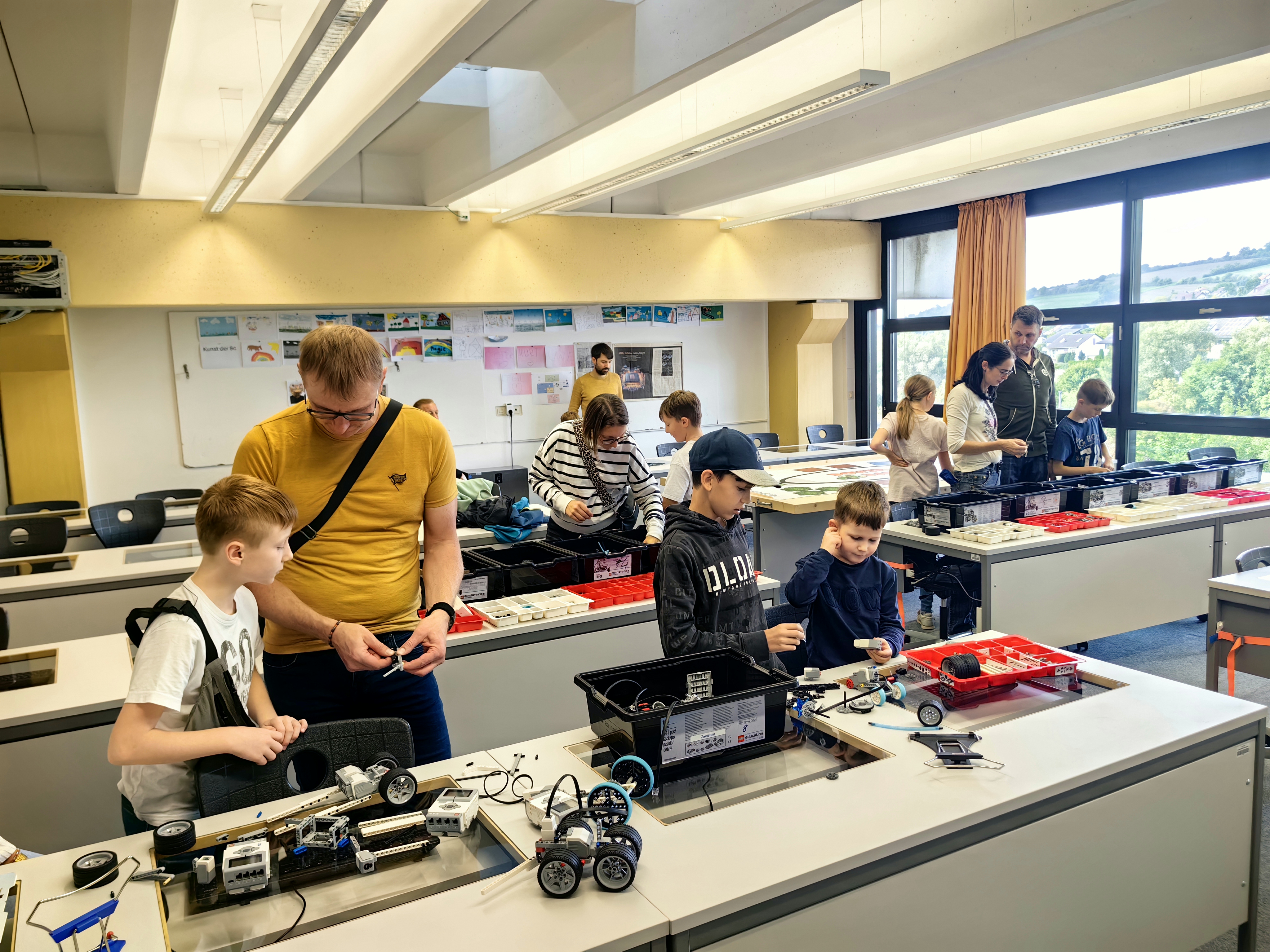 Großen Zuspruch fand auch der Einblick ins Wahlfach Robotik. Im IT-Saal gab es in diesem Jahr die Möglichkeit, mit Lego kleine Roboter zu bauen und diese als einfache Linienfolger auszuprobieren. Eltern und Kinder konnten dabei eigene Ideen umsetzen und erste Einblicke in die Programmierung gewinnen. So wurde anschaulich gezeigt, wie sich technische Grundlagen mit kreativen Ansätzen verbinden lassen.