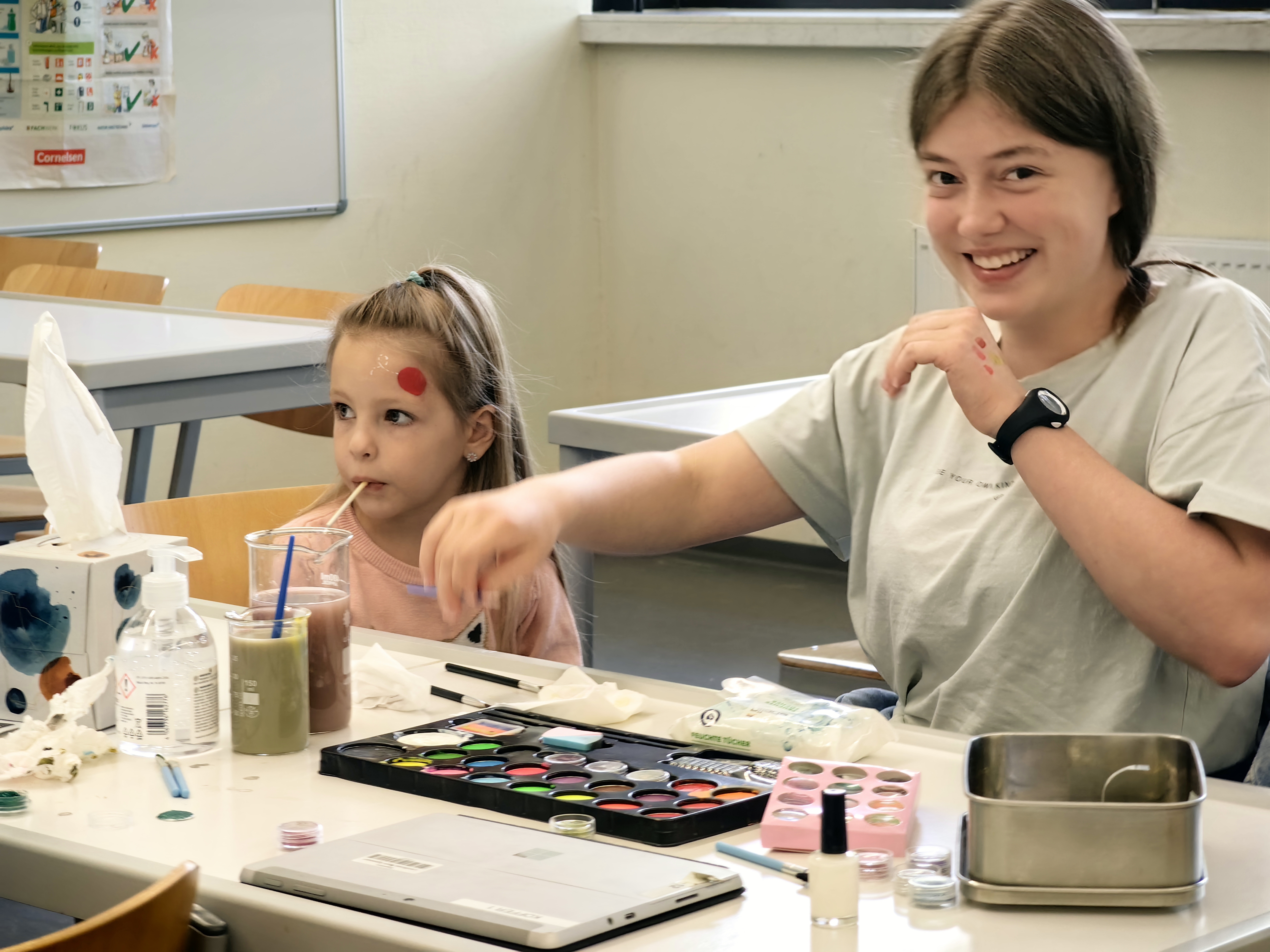 Engagierte Schülerinnen aus der 8., 9. und 10. Klasse sorgten beim Kinderschminken für leuchtende Kinderaugen. Mit bunten Farben und kreativen Motiven verwandelten sie die kleinen Gäste in Schmetterlinge, Löwen und Superhelden – ein echtes Highlight für Groß und Klein!