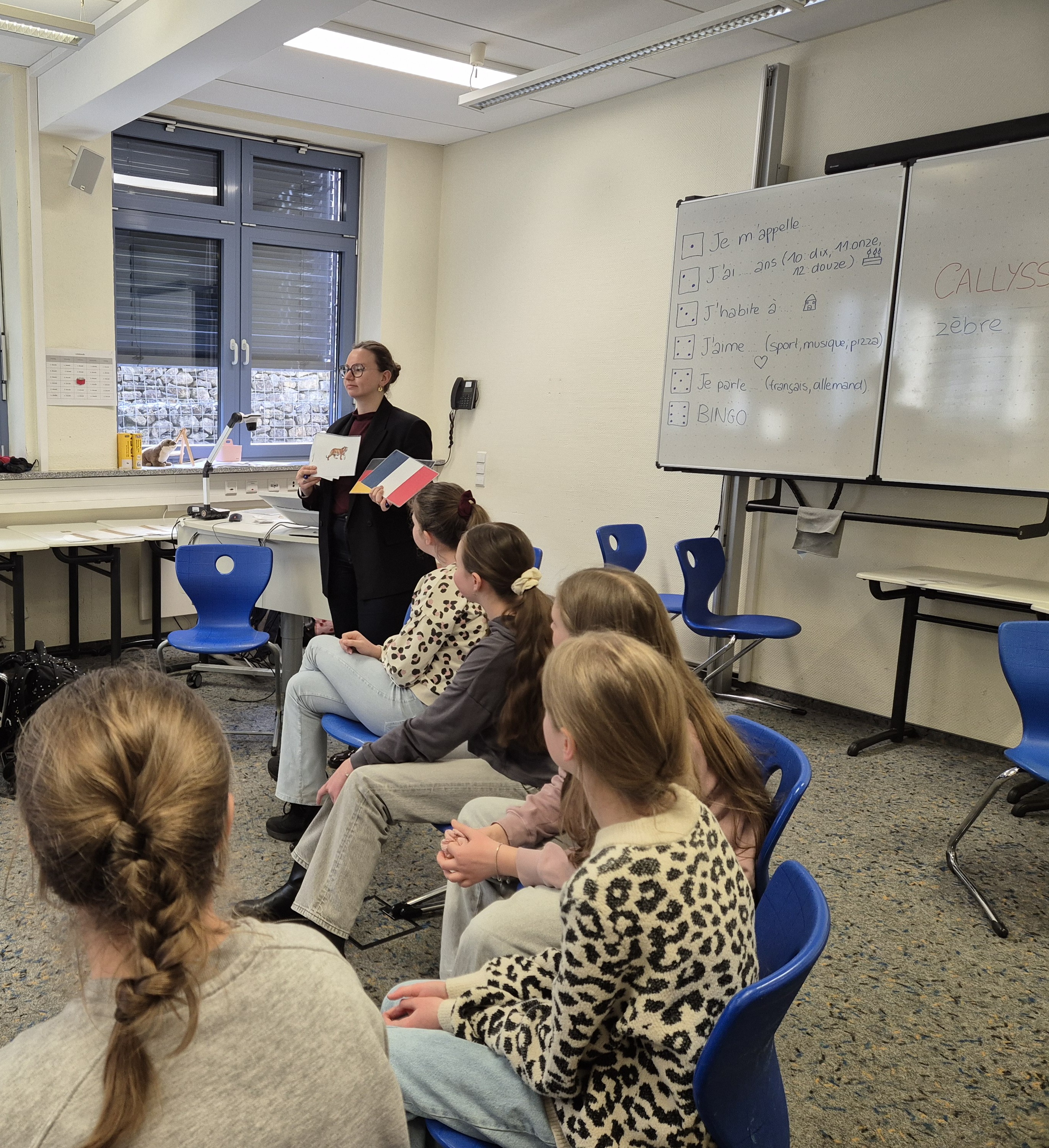 „Salut tout le monde“, eine Aktion des Bezirks Unterfranken zur Förderung der französischen Sprache an unterfränkischen Schulen, kam am 04.02.2026 an die Schule. Durchgeführt wurde diese von der Französin Callyssandre Derette, europäische Freiwillige im Europäischen Soldaritätskorps beim Bezirk Unterfranken. „Je ne parle pas allemand. Je parle français.“/ Ich spreche kein Deutsch. Ich spreche Französisch. Und tatsächlich verlief diese besondere Stunde nur in französischer Sprache. Auf spielerische und unterhaltsame Weise ermunterte Callysandre Derette die Sechstklässler, Französisch zu sprechen. Mit erkennbar viel Spaß ließen sich die Schülerinnen und Schüler auf die verschiedenen Spiele ein und öffneten sich so auch für die neue Sprache. Sie stellten rasch fest, dass es viele transparente Wörter gibt, die leicht zu verstehen sind. Le français, c’est super! (Französisch ist toll!)